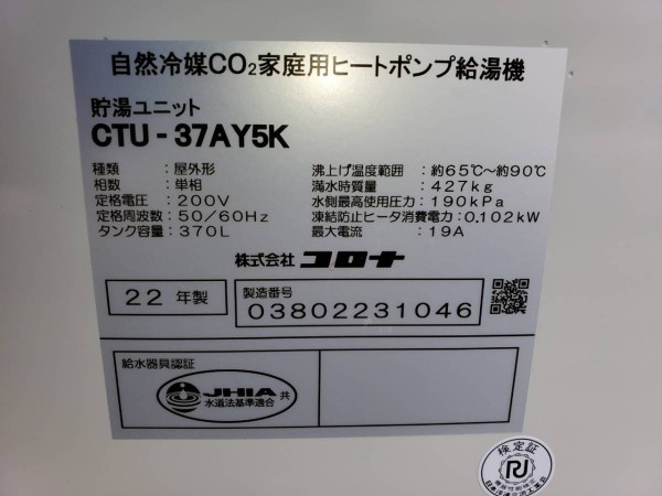 伊予市八倉 コロナエコキュート→自然冷媒CO2家庭用ヒートポンプ給湯機 貯湯ユニットCTU-37AY5K エコキュート交換工事