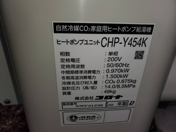 伊予市八倉 コロナ自然冷媒CO2家庭用ヒートポンプ給湯機 貯湯ユニットCTU-37AY5K,ヒートポンプユニットCHO-Y454K エコキュート交換工事