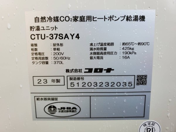 伊予市平岡 コロナ自然冷媒CO2家庭用ヒートポンプ給湯機 貯湯ユニットCTU-37SAY4、ヒートポンプユニットCHP-YA453 エコキュート交換工事|愛媛県のエコキュート専門交換工事店|愛媛エコキュート交換ショップ補助金対応可能