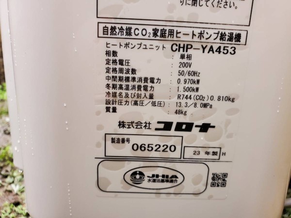 伊予市平岡 コロナ自然冷媒CO2家庭用ヒートポンプ給湯機 貯湯ユニットCTU-37SAY4、ヒートポンプユニットCHP-YA453 エコキュート交換工事