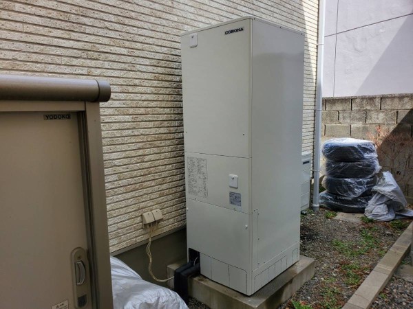 伊予市八倉 コロナ自然冷媒CO2家庭用ヒートポンプ給湯機 貯湯ユニットCTU-37AY5K、ヒートポンプユニットCHP-Y454K エコキュート交換工事