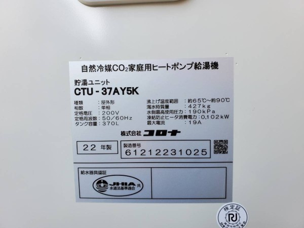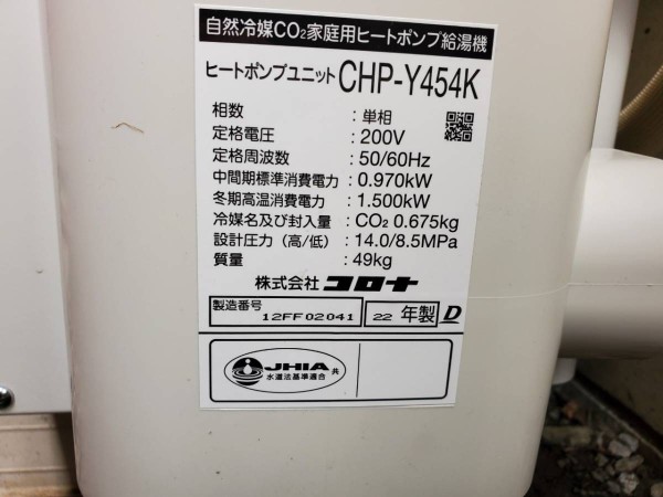 伊予市上唐川 コロナ自然冷媒CO2家庭用ヒートポンプ給湯機 貯湯ユニットCTU-37AY5K、ヒートポンプユニットCHP-Y454K エコキュート交換工事|愛媛県のエコキュート専門交換工事店|愛媛エコキュート交換ショップ補助金対応可能