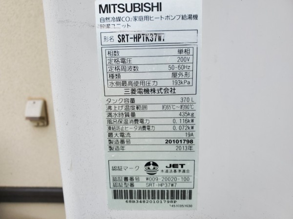 伊予市八倉 三菱電機エコキュートSRT-HPTK37WT→コロナ自然冷媒CO2家庭用ヒートポンプ給湯機貯湯ユニットCTU-37AY5K エコキュート交換工事