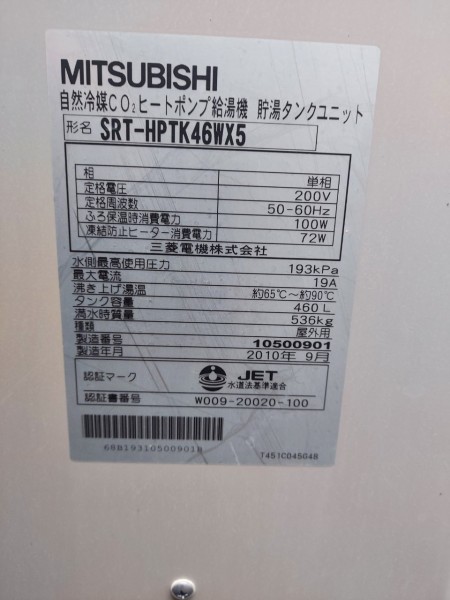 鬼北町吉波 三菱電機エコキュートSRT-HPTK46WX5→三菱電機家庭用自然冷媒CO2ヒートポンプ給湯機貯湯ユニットSRT-STK376D エコキュート交換工事