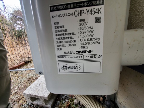 四国中央市中之庄町 コロナ自然冷媒CO2家庭用ヒートポンプ給湯機ヒートポンプユニットCHP-Y454K エコキュート交換工事|愛媛県のエコキュート専門交換工事店|愛媛エコキュート交換ショップ補助金対応可能