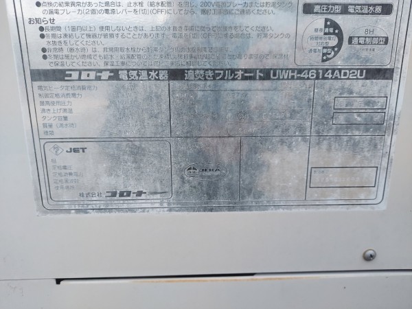 鬼北町広見 コロナ電気温水器UWH-4614AD2U→コロナ自然冷媒CO2家庭用ヒートポンプ給湯機貯湯ユニットCTU-S46AY5K エコキュート交換工事