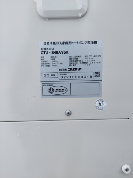 鬼北町広見 コロナ自然冷媒CO2家庭用ヒートポンプ給湯機貯湯ユニットCTU-S46AY5K エコキュート交換工事