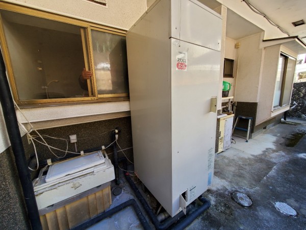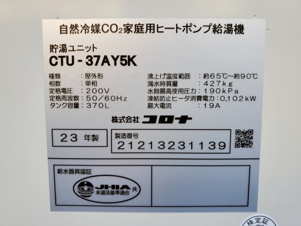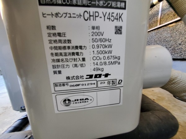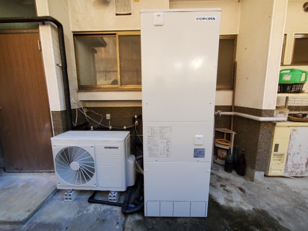 伊予市平岡 コロナ自然冷媒CO2家庭用ヒートポンプ給湯機ヒートポンプユニットCHP-Y454K、貯湯ユニットCTU-37AY5K エコキュート交換工事