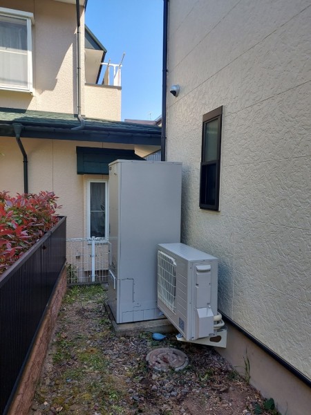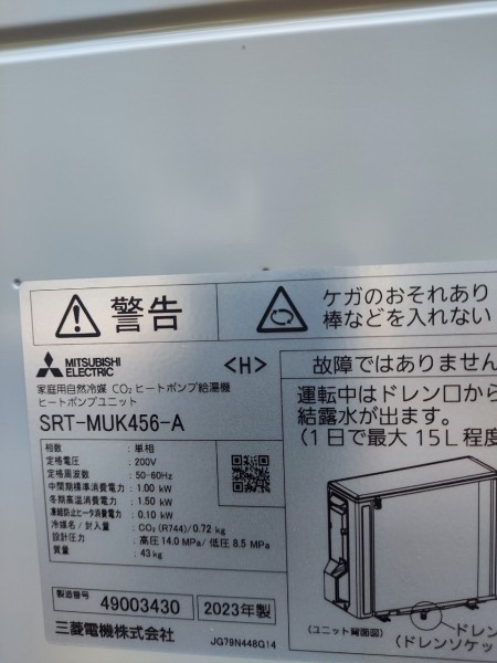 西条市野々市 三菱電機自然冷媒CO2家庭用ヒートポンプ給湯機ヒートポンプユニットSRT-MUK456-A、貯湯ユニットSRT-WTK376D エコキュート交換工事