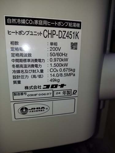 鬼北町吉波 コロナ自然冷媒CO2家庭用ヒートポンプ給湯機 ヒートポンプユニットCHP-DZ451K エコキュート交換工事