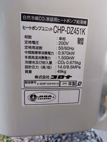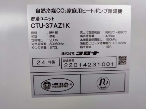 大洲市恋木 コロナ自然冷媒CO2家庭用ヒートポンプ給湯機貯湯ユニットCTU-37AZ1K、ヒートポンプユニットCHP-DZ451K エコキュート交換工事