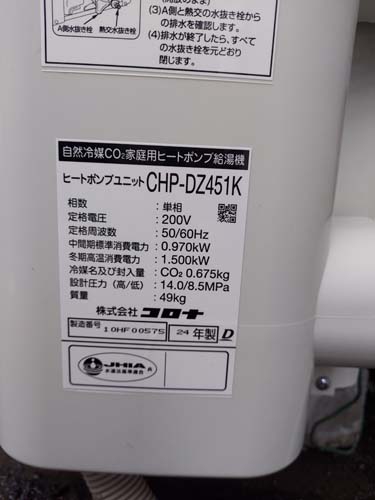 宇和島市蒋淵 コロナ自然冷媒CO2家庭用ヒートポンプ給湯機 ヒートポンプユニットCHP-DZ451K エコキュート交換工事|愛媛県のエコキュート専門交換工事店|愛媛エコキュート交換ショップ補助金対応可能