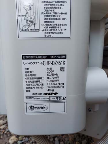 鬼北町芝 コロナ自然冷媒CO2家庭用ヒートポンプ給湯機 ヒートポンプユニットCHP-DZ451K エコキュート交換工事