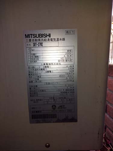 久万高原町二名浦 三菱自動風呂給湯電気温水器SRT-37W2→三菱電機自然冷媒CO2家庭用ヒートポンプ給湯機貯湯ユニットSRT-STK376UD、ヒートポンプユニット エコキュート交換工事
