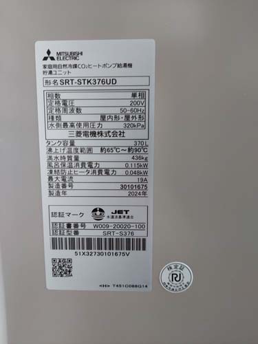 久万高原町二名浦 三菱電機自然冷媒CO2家庭用ヒートポンプ給湯機貯湯ユニットSRT-STK376UD、ヒートポンプユニット エコキュート交換工事|愛媛県のエコキュート専門交換工事店|愛媛エコキュート交換ショップ補助金対応可能