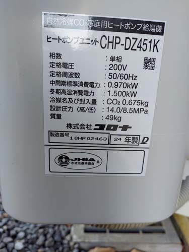 上島町魚島 コロナ自然冷媒CO2家庭用ヒートポンプ給湯機 ヒートポンプユニットCHP-DZ451K エコキュート交換工事