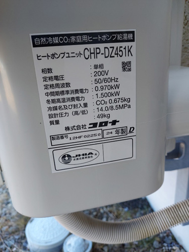伊予市森 コロナ自然冷媒CO2家庭用ヒートポンプ給湯機 ヒートポンプユニットCHP-DZ451K エコキュート交換工事|愛媛県のエコキュート専門交換工事店|愛媛エコキュート交換ショップ補助金対応可能