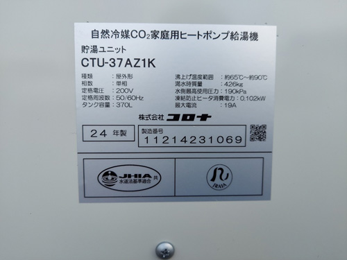 伊予市八倉 コロナ自然冷媒CO2家庭用ヒートポンプ給湯機貯湯ユニットCTU-37AZ1K、ヒートポンプユニットCHP-DZ451K エコキュート交換工事