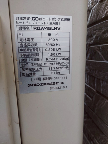伊方町与侈 ダイキン自然冷媒CO2ヒートポンプ給湯機ヒートポンプユニットRQW45LHV→コロナ自然冷媒CO2家庭用ヒートポンプ給湯機貯湯ユニットCTU-37AZ1K、ヒートポンプユニットCHP-DZ451K エコキュート交換工事