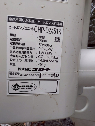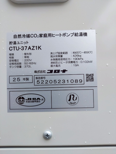 伊方町与侈 コロナ自然冷媒CO2家庭用ヒートポンプ給湯機貯湯ユニットCTU-37AZ1K、ヒートポンプユニットCHP-DZ451K エコキュート交換工事